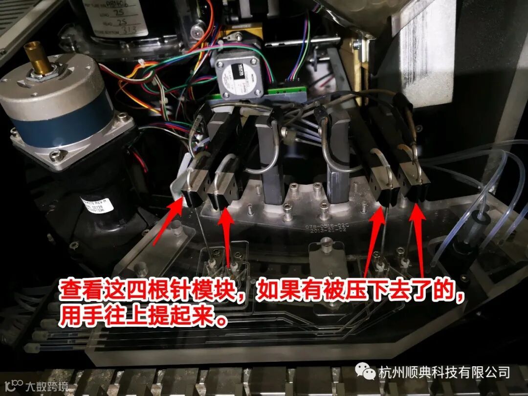 3、处理完以上步骤时,注意看下清洗分离针有没有被身体不下心碰到,压下去了一些,如果有手动抬起来。(因为复位时清洗分离针不会自动抬起,大环转动时会将针撞弯。)