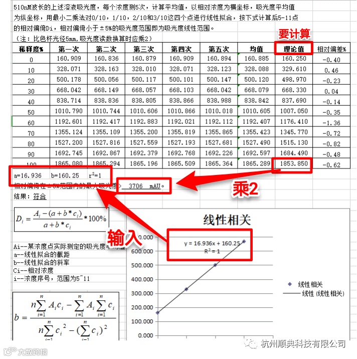2、理论值计算:理论值=稀释度 * 斜率a+截距b(例如10%稀释度理论值=10a+b,例如100%稀释度理论值=100a+b)。