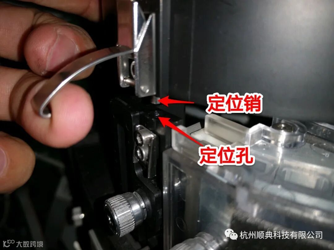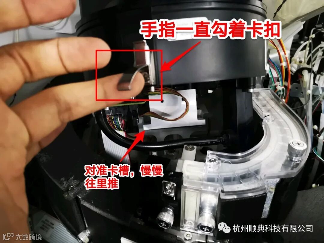 3、装回暗盒:用一个手指抵着卡扣,要不然快装上的的时候容易挂到螺丝,挂上不好弄。底部是卡槽式的,只要卡进去,慢慢往里推到底就行。推到位后注意卡扣下有个定位销,注意要将定位销销进定位孔,再扣上卡扣。
