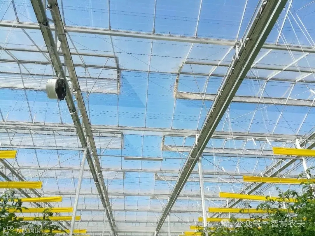 为了营造适宜番茄生长的光线、温度和湿度,温室顶布设两层薄薄的遮阳网,根据探头监测的光照强度,遮阳网自动收展来调节温室内光照量,满足番茄不同生长阶段对光照的需求量。在冬天,遮阳网还可为温室保温。