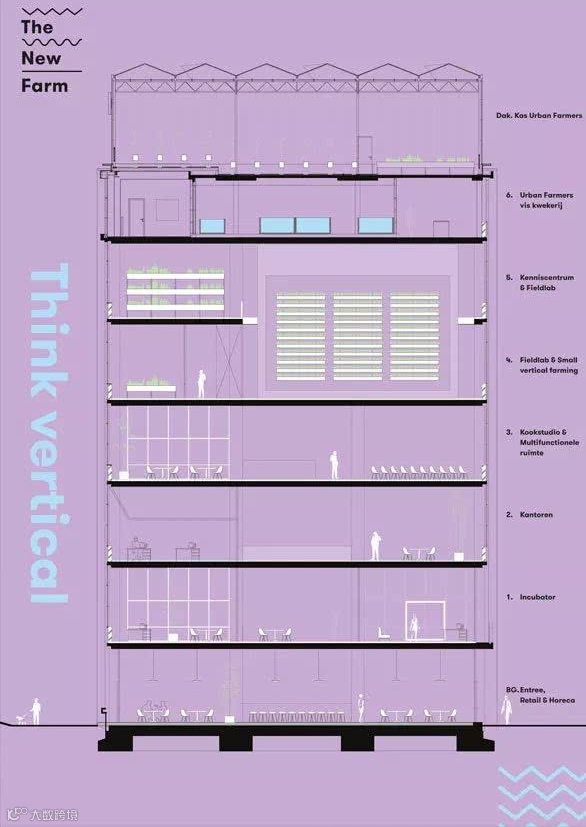 从五楼开始便是“新农场”的农业活动区域,五楼的LIVINGLAB和小型垂直农业为创新型公司提供了在实践中应用垂直城市农业的机会,六楼则是农场的知识中心和FIELDLAB。七楼的屋顶温室生产区安装了工业规模的水培系统,该空间也可以用作养鱼场。在顶楼,“新农场”建造了一个1000平方米的屋顶温室,种植了西红柿、茄子、西葫芦、辣椒和多叶蔬菜。