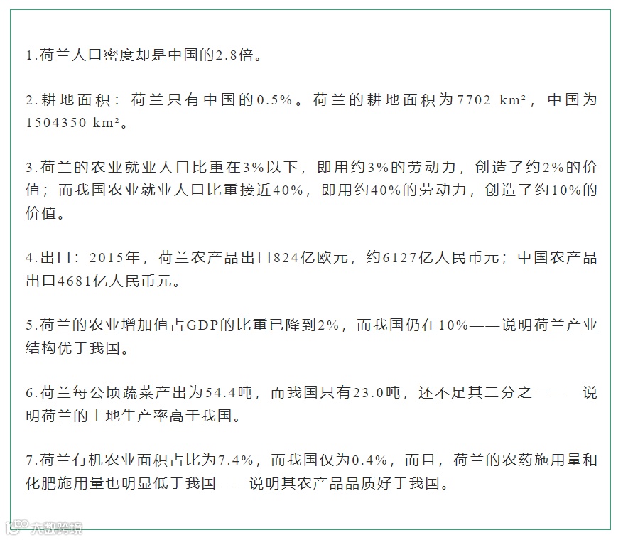 “荷兰只有22万农民,一年却能创造820亿美元的农业出口;中国有2.2亿农业劳动力,同期农产品却比荷兰少110亿美元,农产品贸易逆差达400多亿美元。”国家统计局原总经济师、国务院参事室特约研究员姚景源最近在一次公开的大会上是这样描述中国农业与荷兰农业的差距的。