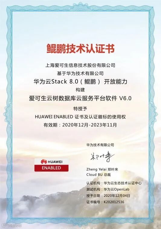 上海爱可生信息技术股份有限公司的“云树RDS(数据库云服务平台)”产品,完成了与华为TaiShan 200系列和华为云Stack8.0(鲲鹏)的兼容性测试,其中爱可生云树数据库云服务平台V6.0被授予华为最高级别的HUAWEI ENABLED证书及相关认证徽标的使用权。