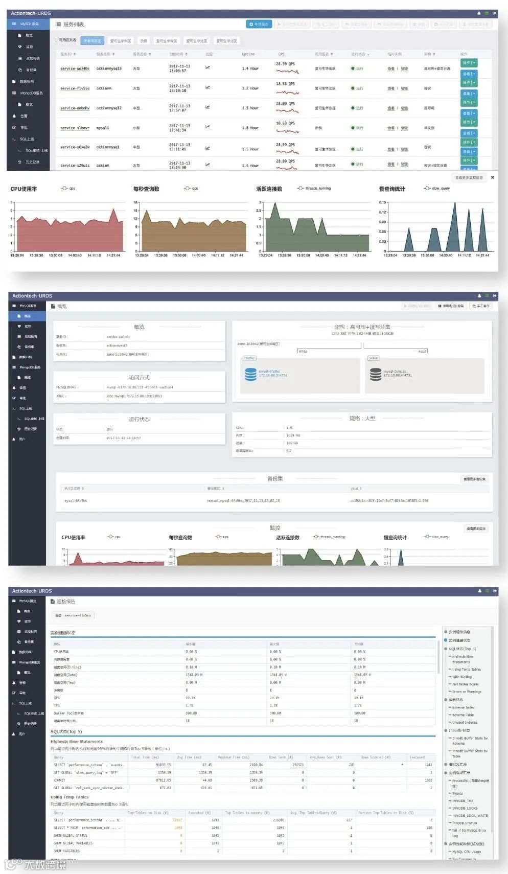 云树RDS(数据库云服务平台)是面向数据库最终用户的关系型数据库云服务平台,让用户可以轻松在私有云上部署、使用开源数据库。通过RDS企业中的开源数据库最终用户部门在几分钟内即可获得极高性能的数据库实例,不仅具备主从热备、备份、回档、监控、快速扩容/缩容、读写分离等全套解决方案,且无需DBA过多干预,告别繁琐的流程和漫长的等待,助推企业利用DevOps实践来更加快速、可靠地构建和交付产品。