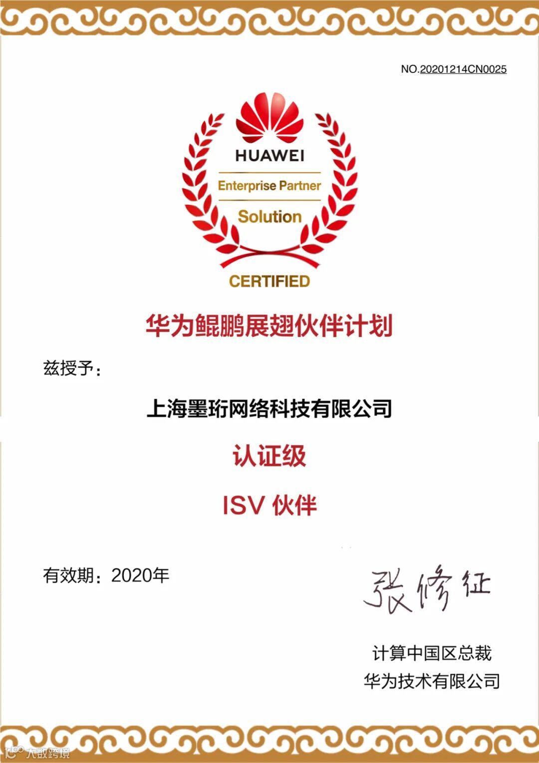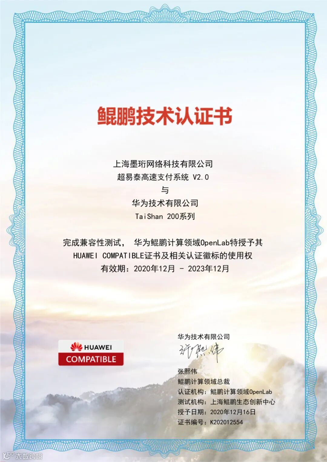 12月16日,上海墨珩网络科技自主研发的超衡联盟链平台、溯源存证服务平台、超易泰高速支付系统分别完成与华为TaiShan服务器产品兼容性测试,荣获华为鲲鹏技术认证书,并成为“华为鲲鹏展翅伙伴计划认证级ISV伙伴”。墨珩科技的超衡联盟链平台等产品在兼容性、安全性、稳定性方面再次得到专业、权威的认可,同时也体现了墨珩科技区块链底层各类产品的商用价值。