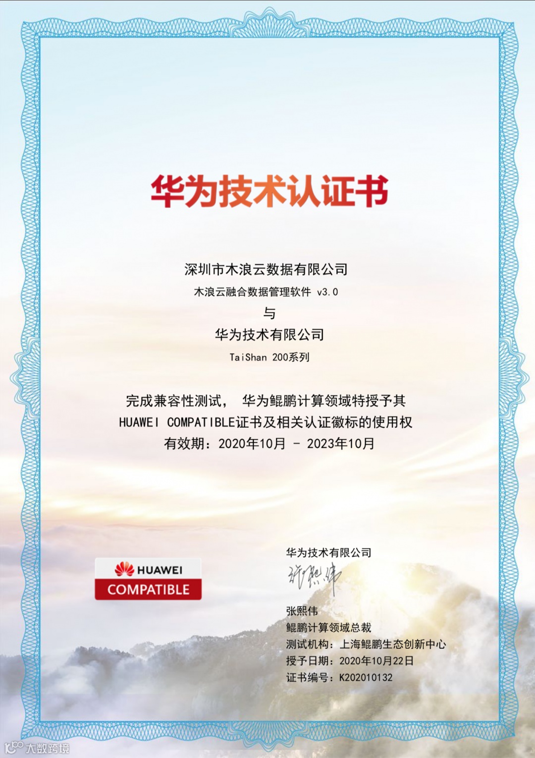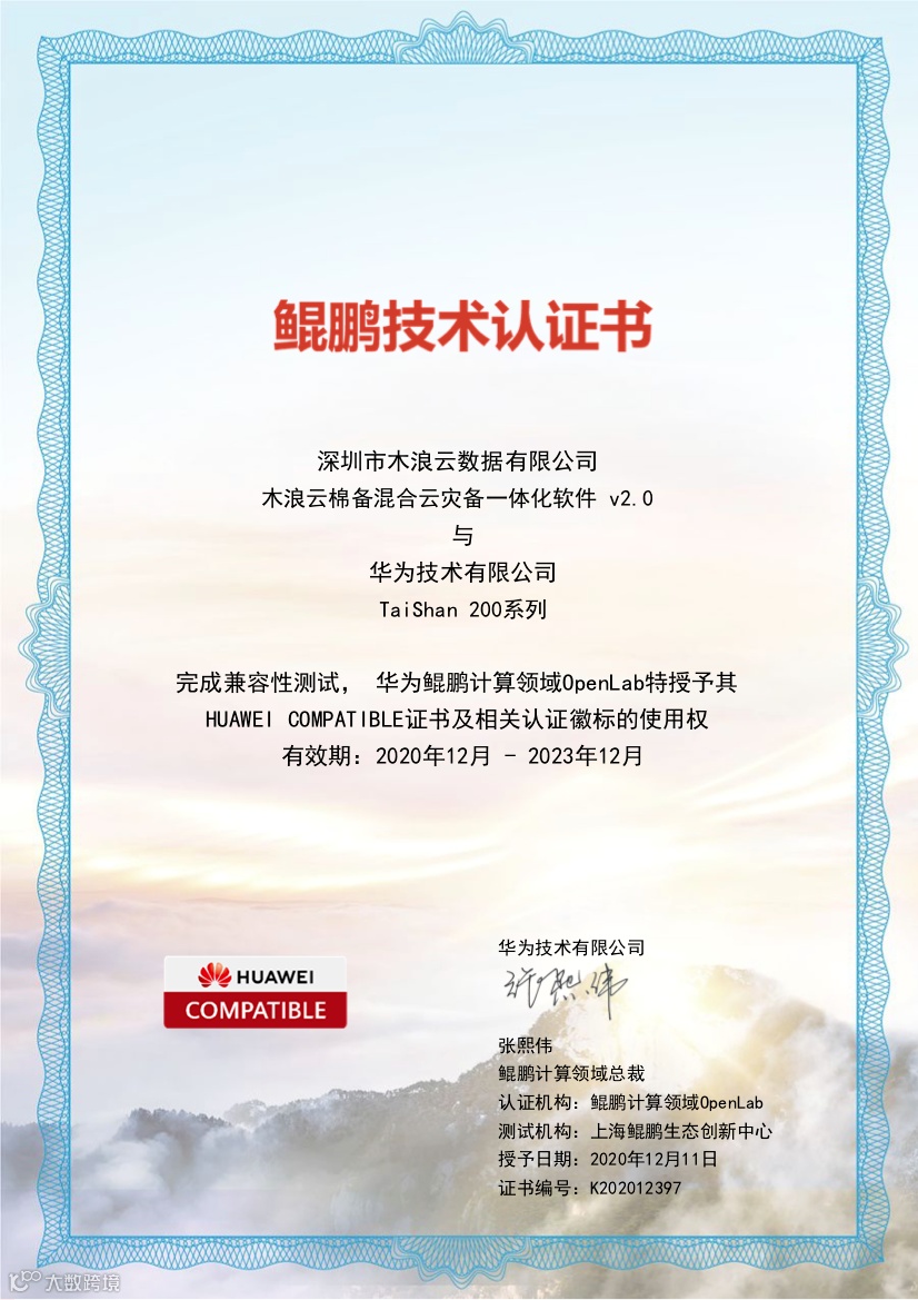 木浪云已完成了基于鲲鹏芯片的华为公有云和华为泰山服务器等产品的适配互认证。包括木浪云融合数据管理软件与华为 TaiShan 200系列、华为云鲲鹏云服务都完成了适配认证,此外还包括棉备混合云灾备一体化软件也与华为 TaiShan 200系列完成了互认证。