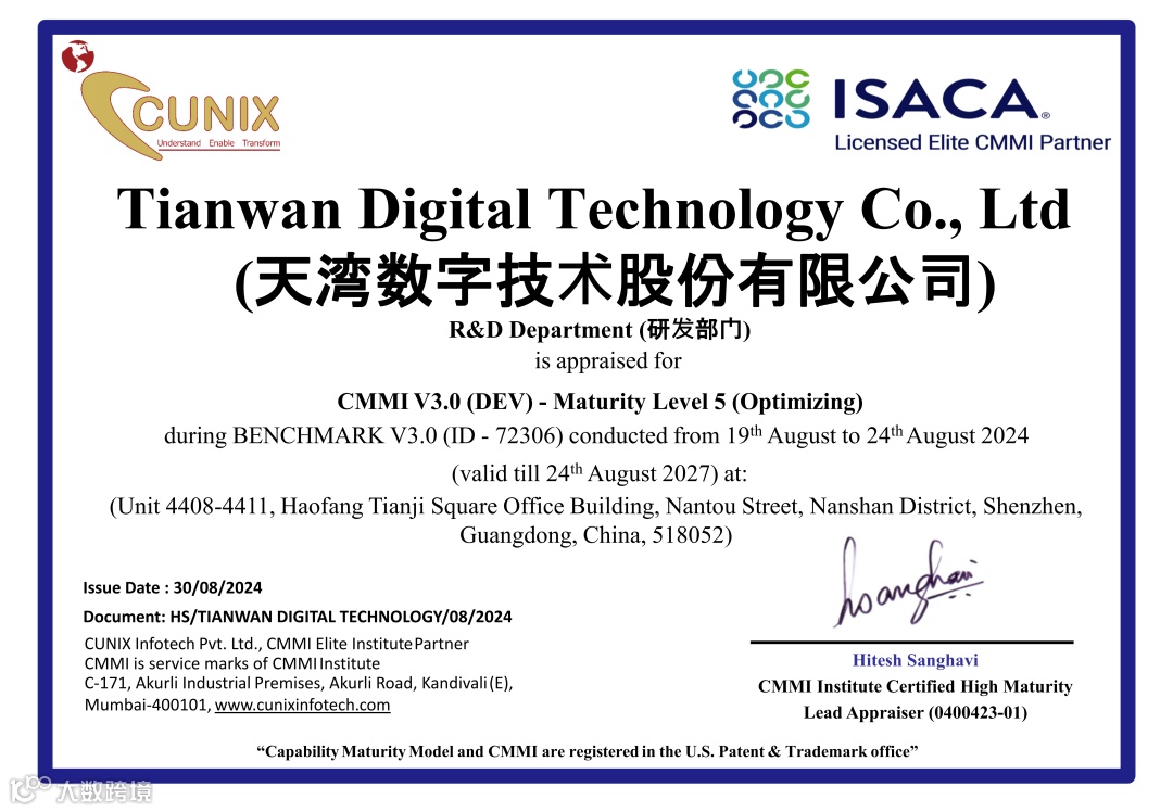 此次斩获CMMI5级评估证书,是对天湾数字多年来在软件研发和项目管理方面不懈努力的高度认可。它标志着天湾数字其在项目研发能力、企业规范化管理等方面都达到了国际先进水平,能够为客户提供更高质量的产品和服务。