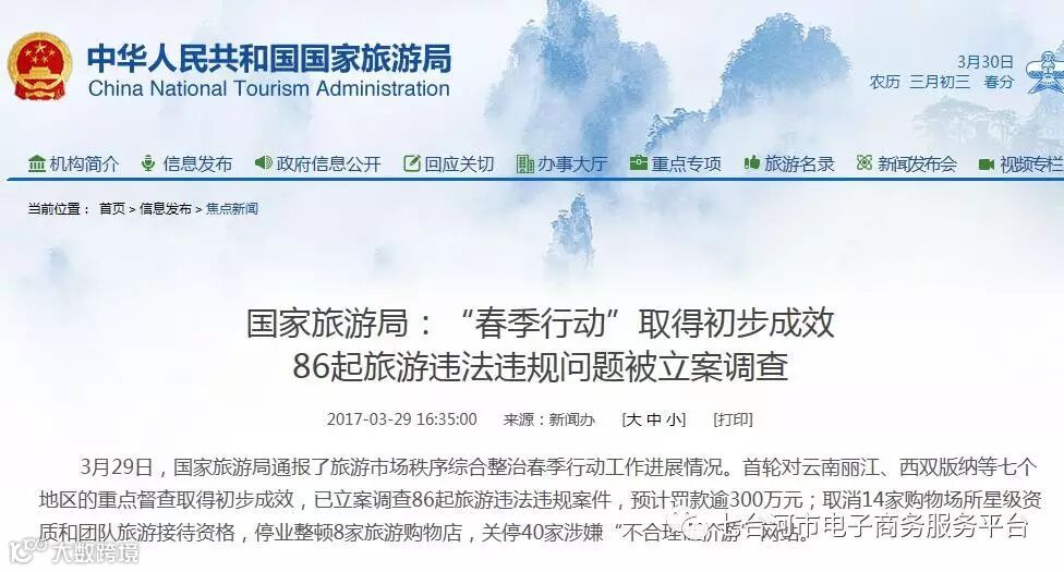 3月29日,国家旅游局通报了旅游市场秩序综合整治春季行动工作进展情况:已立案调查86起旅游违法违规案件,预计罚款逾300万元;取消14家购物场所星级资质和团队旅游接待资格,停业整顿8家旅游购物店,关停40家涉嫌“不合理低价游”网站。