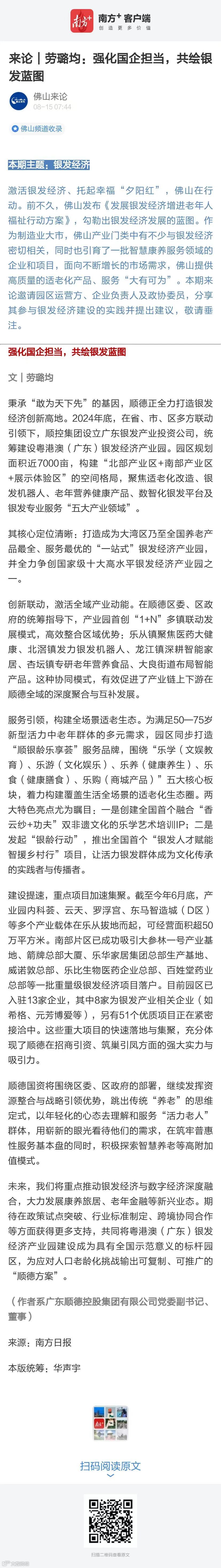 广东顺德控股集团有限公司党委副书记、董事劳璐均,在南方+《佛山来论》栏目中,分享了她参与银发经济建设的实践工作,并提出了相关建议。