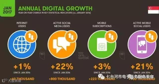 新加坡总人口为574万;城市化水平已达到100%。其中互联网用户高达471万,渗透率占总人数的82%。同时,新加坡的手机用户有844万,平均每人拥有1.47个移动设备。移动社交活跃用户为400万,渗透率70%电商购买渗透率51%。