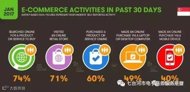并且电子商务活动十分活跃,以最近30天为时间范围,线上购买行为的人数占比约为74%,搜索商品或购买服务为71%,访问在线零售商店为60%。其中PC端购买49%,移动端购买为40%。