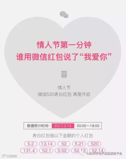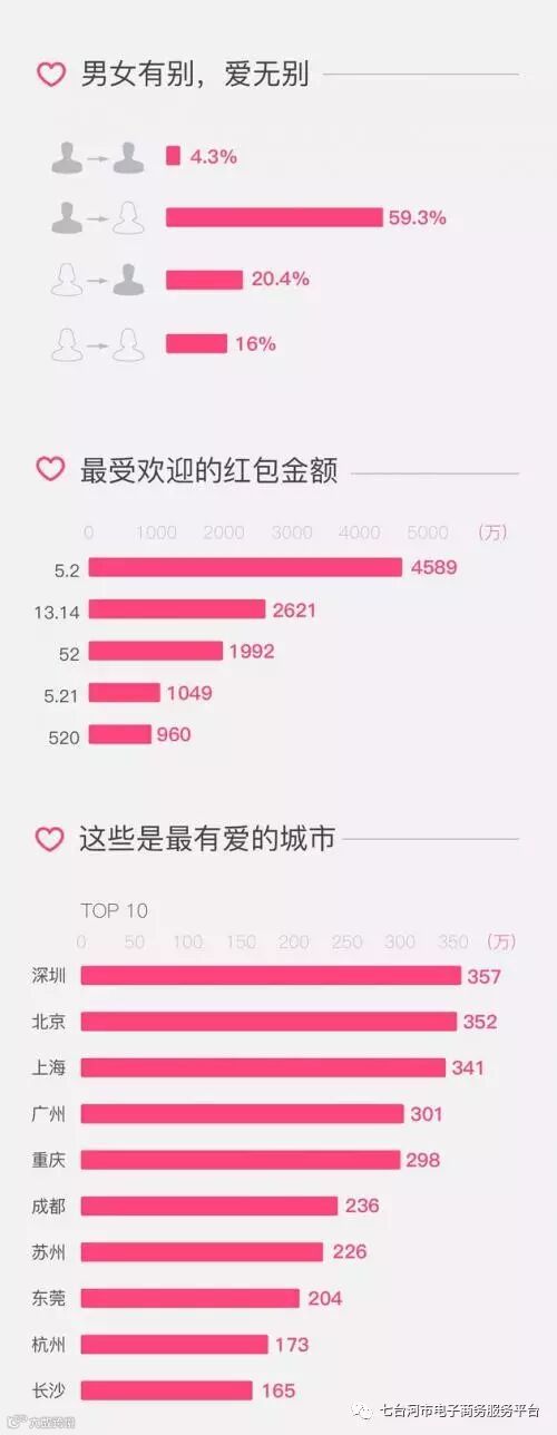 2月14日,微信团队公布了情人节表白红包大数据。数据显示,情人节所有的表白红包中,59.3%是由男性发给女性,20.4%是由女性发给男性,最受欢迎的红包金额为5.2元,共发送了4589万个,而最大金额的520元红包发送了960万个。