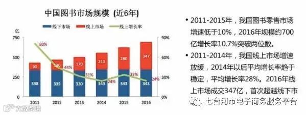 从2011年到2015年,我国图书市场的规模一直都在扩大,但是从线上和线下市场各自的占比不难发现,线下市场的规模基本持平,增长几乎可忽略不计。也就是说,是线上市场贡献了绝大多数增量。16年,线上市场成交347亿,首次超越线下市场。