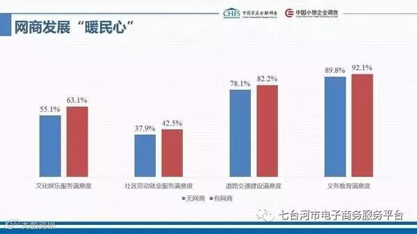 除此之外,网商发达的农村,村民的幸福感也更高。报告显示,网商排名前5%的地区,村民的交通满意度、义务教育满意度和医疗满意度分别达到56.58%、69.10%和56.21%,均高于城市居民。