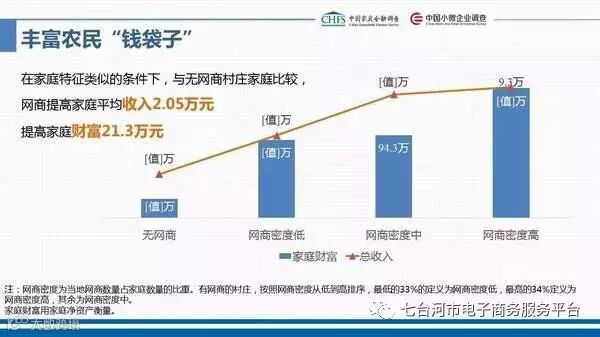 网商的的发展也给当地的经济发展带来了积极作用,据报告显示,随着网商密度的增大,农村地区的家庭总资产、净资产以及收入整体上都呈上升趋势。在家庭特征类似的条件下,与无网商农村家庭比较,网商提高家庭平均收入2.05万元,提高家庭财富21.3万元。
