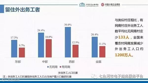同时,留住外出的务工人员,据报告显示,有网商的村庄的外出务工人员比无网商村庄的外出务工人员平均少133人,全国来看,农村网商发展减少外出务工人口约1200万人。