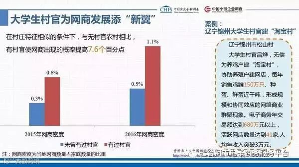 除了硬件措施以外,农村网商高增长离不开大学生村官的推动。数据显示,在村庄特征类似的情况下,与无村官农村相比,有村官网商的出现率提高7.6个百分比。