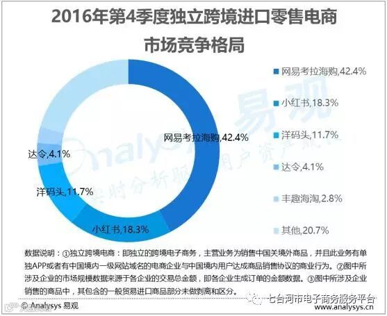 而在在独立跨境进口零售电商市场竞争中,网易考拉海购所占份额为42.4%,以非常巨大的优势占据领头羊的位置。以社区运营见长的小红书,以18.3%的份额排在第二位。而以颇具特色的C2C模式立足市场的洋码头则以11.7%的份额排在第三位。以上三个厂商基本上决定了这个细分领域的走向,近3/4的市场都由其掌控。