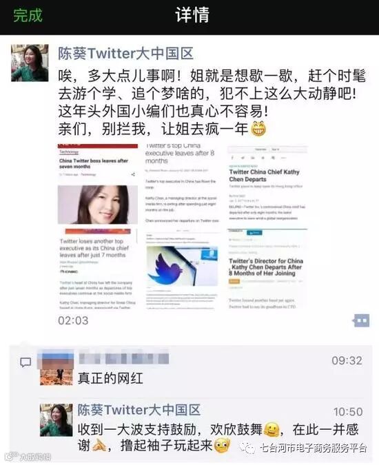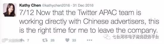 “现在推特的亚太地区团队直接与中国广告商合作,这也是我离开公司的时候了。”陈葵在宣布离职的推文中写道。“我们会继续致力于这个市场”,并表示公司在香港的办公室将继续运营,“维持与大中华区广告主的良好关系及合作商机。”