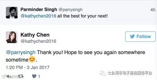 陈葵宣布离职后,推特前印度、南亚和中东地区市场负责人Parminder Singh在推特上向其表达祝福:“希望你接下来一切都好!”
