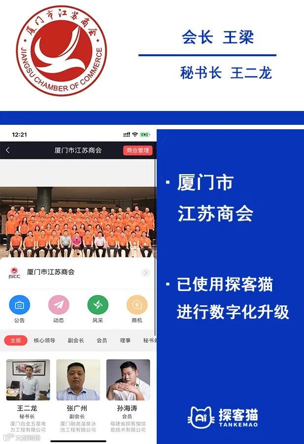 厦门市江苏商会自2017年1月份经过5次筹备会后于2017年5月21日正式成立,王梁为会长,姜忠为监事长,王二龙为秘书长。