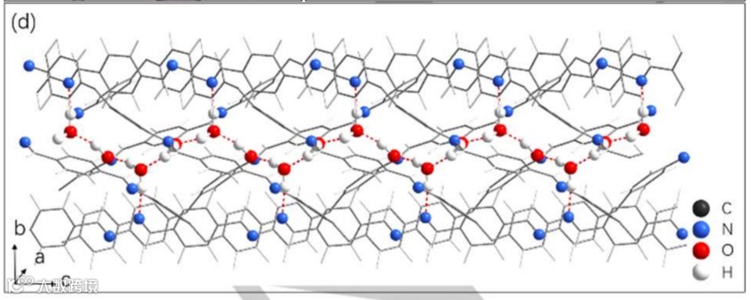 COF-300-H2O样品的 cPEDT数据分辨率高于 0.8 Å,Rint 值为16.29%。沿[001] 动态细化获得的COF-300-H2O 结构的表示(氢,白色;碳,棕色;氮,蓝色;氧,红色;虚线代表氢键相互作用)。