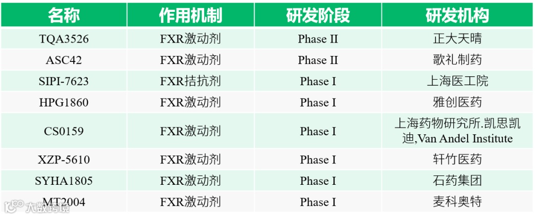 由于FXR与代谢调节密切相关,其激动剂/拮抗剂成为代谢性疾病治疗的药物研发热点。多家制药公司和学术实验室已经开发了大量的FXR配体,包括奥贝胆酸(OCA)、cilofexor(GS-9674)、MET409、nidufexor (LMB763)、tropifexor (LNJ-452)和EDP-305在内的几种化合物目前正在临床试验中用于治疗NASH、PBC、PSC和肝纤维化。FXR拮抗剂包括Centatin、SIPI-7623、HS218等,其中Centatin由Zydus Lifesciences Ltd公司研发,目前处于临床一期,主要适应症为高脂血症;SIPI-7623是由上海医工院和江苏柯菲平联合开发的,目前处于临床一期,适应症为混合型高血脂;上海药物所开发的FXR拮抗剂HS218处于临床前,适应症为II型糖尿病。