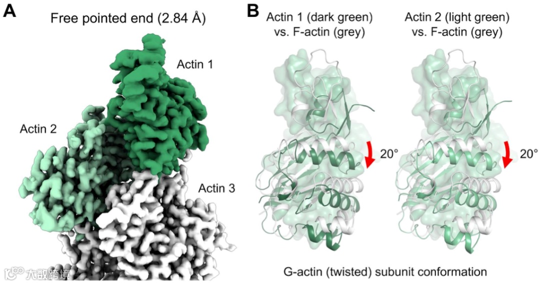比较意外的是,游离尖末端的两个亚基呈现出了G-actin的构象,他们的D-loop是无序的,这和大多数G-actin的结构是一致的 (图3)。