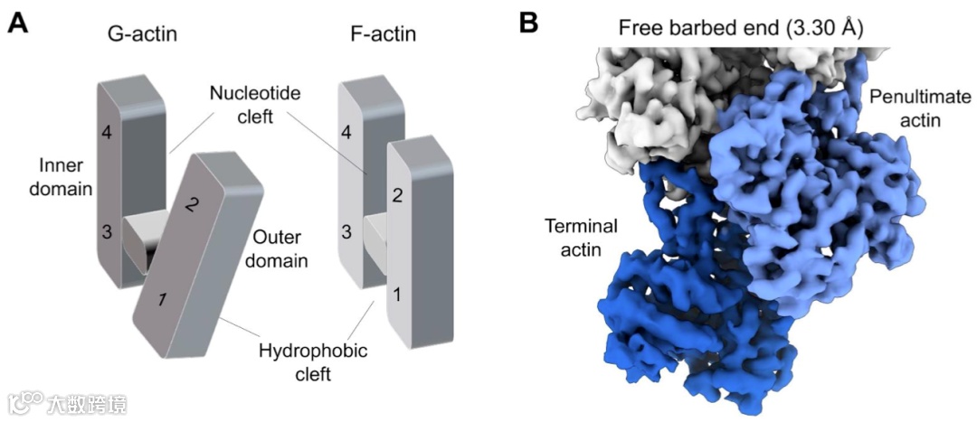 最近发表了F-actin和不同核苷酸 (ADP,ADP-Pi和ATP同系物) 结合的冷冻电镜结果,揭示了F-actin中间的亚基结构以及多聚时引起ATP水解的构象变化。然而,F-actin的结构在结合核苷酸或者二价离子之后变化很小,所以,尽管在大约四十年前ATP肌动蛋白和ADP肌动蛋白在F-actin末端的结合和解离常数已经被确定了,但是我们对于F-actin末端动力学不对称性的结构基础仍然知之甚少。