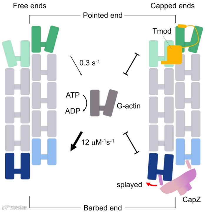图5. 游离和加帽的F-actin末端亚基的结合和解离模型