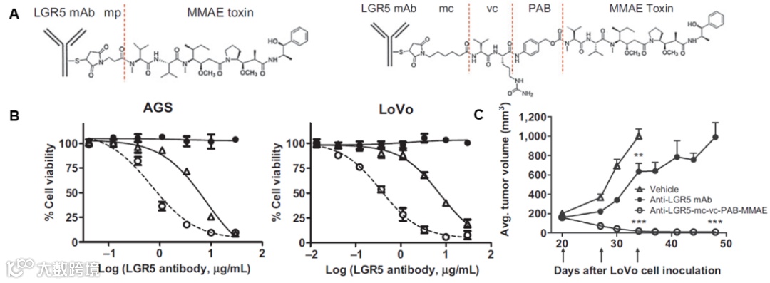 UTHealth分子医学研究所的研究人员开发了靶向LGR5的ADC,该ADC由大鼠-人嵌合LGR5 mAb与MMAE偶联组成[15]。利用两种不同Linker (MC-VC-PAB vs MP)进行ADC构建,二者均与链间半胱氨酸残基偶联(DAR=4,图5A),并显示能够以高亲和力特异性结合LGR5、内化并转运至溶酶体,与母体mAb相当。在LGR5高表达的LoVo (结直肠)和AGS (胃癌)癌细胞中,具有可裂解Linker的ADC比具有不可裂解Linker的ADC表现出11倍的效力(IC50分别为2–4.5 nM与47–51nM),因此含可裂解Linker的ADC被选为体内研究的先导药物(图5B),且该ADC对LGR5阴性癌细胞系没有影响,证明其靶标特异性。 在LoVo CRC异种移植模型中,含可裂解Linker的ADC治疗可导致肿瘤消除,并且没有观察到脱靶毒性(图5C)。