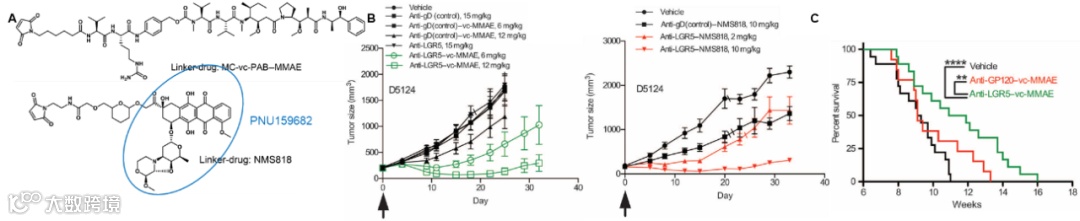 NMS818中含有PNU159682,其是一种插入DNA的蒽环类药物,可抑制拓扑异构酶II。MMAE在分裂细胞中表现出高效力,而PNU15982在亚纳摩尔浓度下表现出更高的效力,并在非分裂细胞中表现出细胞杀伤作用。这表明抗LGR5-NMS818可能具有更广泛的细胞杀伤范围,但也可能会增加正常组织毒性。该两款ADC在LGR5高表达D5124原代人胰腺癌异种移植模型中表现出相似的效力,导致肿瘤停滞或消退;裸抗和同种型对照抗体对肿瘤生长均没有显著影响,对照组ADC可导致肿瘤有一定程度的消退,但与靶向LGR5的ADC相比效果要差得多(图7B)。抗LGR5-NMS818显示出严重的肠道和肝脏毒性,而抗LGR5-MMAE治疗的小鼠则没有这种毒性,表明Linker-Payload的选择对于ADC耐受性至关重要。在APCmin/+; KRASLSL-G12D/+; Villin-Cre基因工程小鼠肠道肿瘤发生模型中进一步评估抗LGR5-MMAE的活性,长期治疗可显著提高生存率并缩小肿瘤体积(图7C);然而,与对照组相比,肿瘤总数没有变化。这与MMAE已被证明对胃肠道肿瘤相对无效有关。因此研究其他Linker-Payload组合将会更有意义。与其他小组的研究相结合,这些发现展现出靶向LGR5治疗不同类型癌症的潜力。