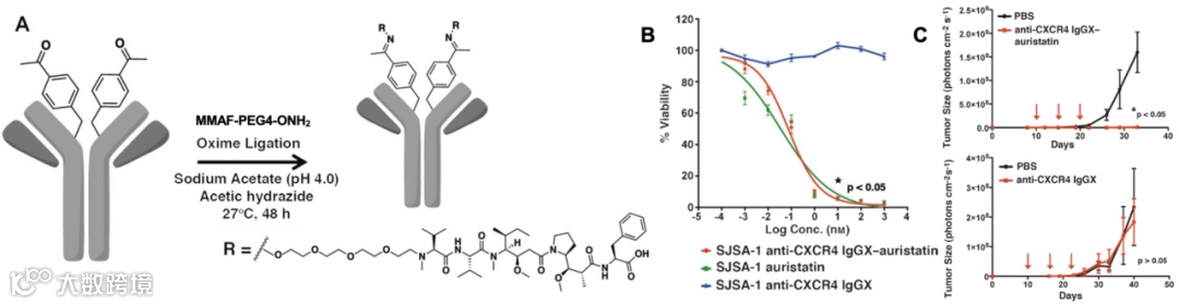 第一个靶向CXCR4的ADC由美国斯克利普斯研究所(Scripps Research Institute)Peter G. Schultz教授组开发,研究其对CXCR4+转移性肿瘤的治疗效果[7]。使用不可裂解的亲水性Linker-Payload (MMAF-PEG4-ONH2)与非天然氨基酸对乙酰基苯丙氨酸(p-acetylphenylalanine, pAcF)进行位点特异性偶联成肟生成高亲和力的抗CXCR4 ADC (IgGX-MMAF),DAR=2 (图2A)。MMAF含有末端羧基,细胞渗透性极小,几乎无旁观者效应,可降低对非复制造血干细胞的脱靶细胞毒性。利用高表达CXCR4的人骨肉瘤细胞系(SJSA-1-met)评估体外疗效,经IgGX-MMAF处理后,SJSA-1-met细胞活力显著降低(IC50=0.08 nM),而CXCR4 mAb处理没有明显抑制效果(图2B);同时,IgGX-MMAF对CXCR4阴性细胞无抑制效果。体内功效研究表明,使用CXCR4 mAb或IgGX-MMAF进行肺部肿瘤治疗,IgGX-MMAF在第8天时几乎无法检测到肿瘤,而CXCR4 mAb治疗的肿瘤与对照组相当(图2C)。目前,尚未报告该ADC的后续疗效或安全性研究。