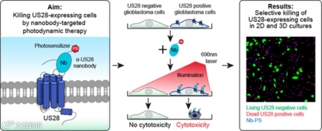 Vrije Universiteit Amsterdam和Utrecht University的科研人员开发了一种靶向US28的纳米抗体偶联物(VUN100-PS),利用已有的US28-Nb[31]通过其C端未配对的半胱氨酸与水溶性光敏剂Mal-IRDye700DX偶联获得,不影响Nb的结合亲和力(图11)[32]。该偶联物可选择性杀死2D培养物以及3D球体中表达US28的胶质母细胞瘤细胞。这些数据表明靶向GPCR纳米抗体在光动力疗法(Photodynamic therapy, PDT)领域的潜力。