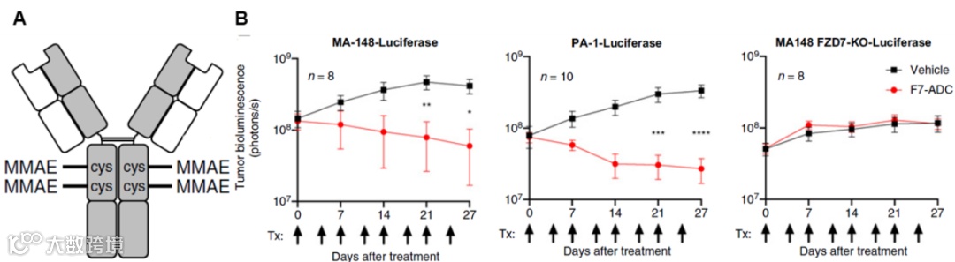 加州大学圣地亚哥分校(UCSD)的研究人员开发了一款抗FZD7的ADC-Septuximab vedotin,由嵌合人-小鼠FZD7 mAb通过可裂解MC-VC-PABC-MMAE偶联,DAR=4 (图8A)。与FZD7敲除(KO)的(OVCAR3和MA-148 FZD7-KO; IC50=25–60 nM)卵巢癌细胞系相比,Septuximab vedotin在FZD7+ (MA-148和PA-1; IC50=5 nM)中的效力增强。使用表达荧光素酶的MA-148、PA-1和MA-148 FZD7-KO异种移植模型测试其体内活性,MA-148和PA-1肿瘤能够得到明显消退,而在MA-148 FZD7-KO中未观察到显著的肿瘤生长抑制(图8B)。由于Septuximab vedotin特异性结合人FZD7,因此使用CRISPR-Cas9对小鼠进行工程改造,将Fzd7上的mAb表位从小鼠序列转换为人序列(Fzd7hF7/hF7),未观察到对小肠隐窝/绒毛结构的明显毒性或损伤。此外,该ADC避免了全局Wnt抑制相关的脱靶效应。这些初步结果使该ADC在PDX和免疫活性模型中的进一步测试合理化,以评估其临床潜力。