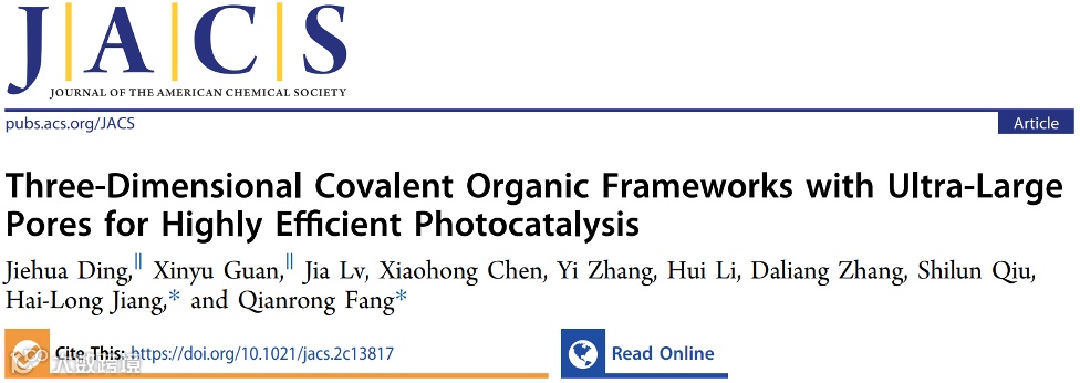 Jiehua Ding, Xinyu Guan, Jia Lv, Xiaohong Chen, Yi Zhang, Hui Li, Daliang Zhang, Shilun Qiu, Hai-Long Jiang, Qianrong Fang. Three-Dimensional Covalent Organic Frameworks with Ultra-Large Pores for Highly Efficient Photocatalysis. J. Am. Chem. Soc. 2023. DOI: 10.1021/jacs.2c13817.