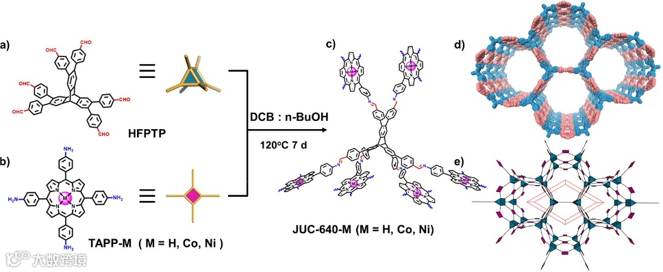 图2. (a) HFPTP作为六连接3D-D3h核心构建模块的分子结构。(b) TAPP-M作为协同四连接2D-D4h单体的分子结构。(c)由HFPTP和TAPP-M进行缩合反应生成新型3D COFs, JUC-640-M (M = H, Co, or Ni)的分子结构。(d) JUC-640-M和(e) stp网格的扩展框架。