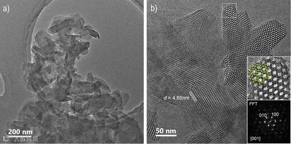 图1. JUC-640-H的(a) TEM图和(b)高分辨率TEM图。图b中的插图为白色框标记区域的裁剪放大图,并覆盖有结构模型。裁剪区域的FFT衍射被归结于[001]区域轴。