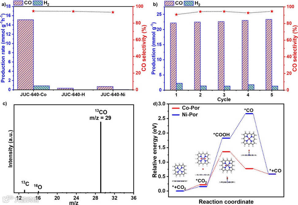 图6. (a) JUC-640-M的光催化活性对比。(b) JUC-640-Co的耐久性测试(2 h一次循环)。(c) JUC-640-Co的13C同位素标记测试。(d) JUC-640-M (M = Co或Ni)上CO2还原为CO的自由能。