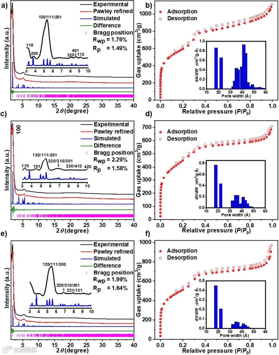 图3. (a) JUC-640-H, (c) JUC-640-Co, (e) JUC-640-Ni的实验测试与精修PXRD衍射结果。(b) JUC-640-H, (d) JUC-640-Co, (f) JUC-640-Ni在77 K下的N2吸附-脱附等温线,插图为孔径分布曲线。