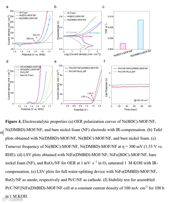 结论:由于设计和合成了具有硫醇-镍配位链的结构明确的 MOF 材料,我们基于 cRED 数据集解析出Ni(DMBD)-MOF 的新晶体结构。HRTEM 研究进一步证实了 cRED 结构。计算结果表明 Ni(DMBD)-MOF 具有金属电子结构,由于 Ni-S 配位链含有较少的电负性硫供体,因此导电性增强。与Ni(DMBD)-MOF的电子结构一致,获得了令人满意的电催化活性。实验结果和 DFT 计算显示,在Ni(DMBD)-MOFs 中 ,Oads 中间体很容易形成,活化能势垒也降低了。引入 Fe后获得的 2维NiFe(DMBD)-MOF/NF 在 100 mA·cm-2的电流密度下显示出 280 mV 的过电位。具有硫醇官能化的 NiFe(DMBD)-MOF/NF 作为阳极电极的分解水的电解槽在以 Pt/C 为阴极组装的碱性电解质中记录了 1.50 V@10 mA·cm-2 的外加槽电压。这种有机连接物工程策略不仅为筛选水分解电催化剂提供了一个有前景的 MOF 结构平台,而且将推动人们进一步追求这种分子工程策略,以获得更广泛的先进 MOF 催化剂阵列。