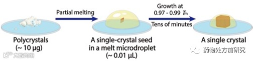 药物晶体通常是通过溶液结晶得到的,但由于引入溶剂,有些晶型很难通过溶液结晶得到,尤其是亚稳晶型,因为这些亚稳晶型会在溶剂中快速发生转晶。而熔融结晶则可以避免出现这样的情况,尤其是在晶种的诱导下,晶体不断生长,固态不太容易发生重结晶。在药物多晶型研究时,尤其是单晶培养时可以考虑引入熔融结晶,以解决得不到目标晶型,或者晶体尺寸太小不能满足单晶测试的情形。当然,需要注意的是,熔融结晶对化合物的热稳定性有一定的要求。如果样品熔融伴随着分解,或者根本没有熔点,此时就很难通过熔融法去制备得到单晶样品。参考文献:Ou, Xiao, et al. "A general method for cultivating single crystals from melt microdroplets." Chemical Communications 56.69 (2020): 9950-9953.