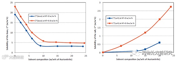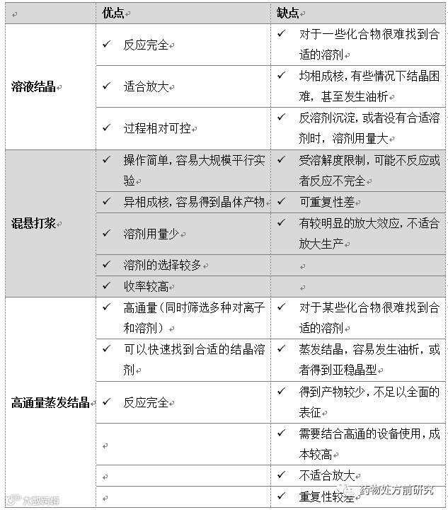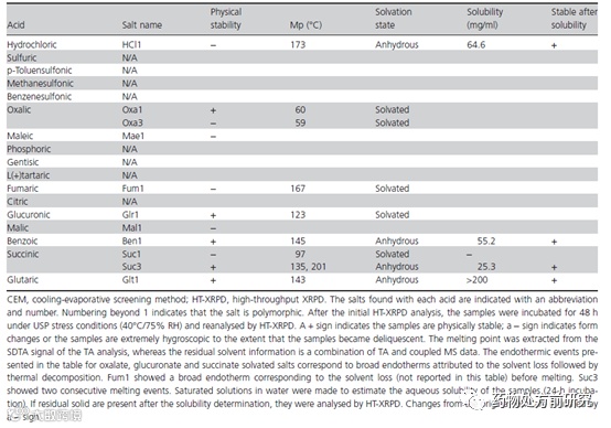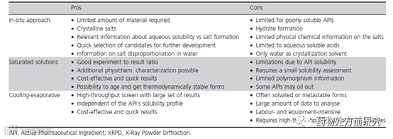下面来看一篇文献,Fernández Casares A, Nap W M, Ten Figás G, et al. An evaluation of salt screening methodologies[J]. Journal of Pharmacy and Pharmacology, 2015, 67(6): 812-822.。Ana Fernández Casares等人对比了三种盐型筛选的方法,三种方法分别为:原位成盐(混悬打浆),饱和溶液结晶和冷却蒸发结晶。其中原位成盐通常被用于临床前制剂开发,优点在于无需耗费太多的精力去提前制备盐,而是直接将游离态加入酸或碱的溶液中,得到的溶液或混悬液就可以直接用于给药。由于是直接用于给药,所以一般都是用水作为溶剂。