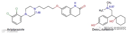 实验选择了两个溶解性差异很大的化合物进行比较,阿立哌唑和去甲文拉法辛,两个化合物均为游离碱。其中阿立哌唑(aripiprazole)溶解度很差,只有7.8 μg/ml,最强碱性位点的pKa为7.5。另一个化合物去甲文拉法辛(desvenlafaxine)溶解度较高,1.4 mg/ml,几乎是阿立哌唑的200倍。去甲文拉法辛最强碱性位点的pKa为8.9。两个化合物的化学结构式如下: