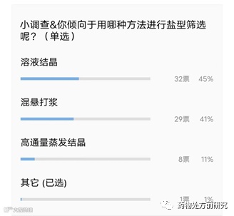 盐型筛选的方法有很多,但真正广泛应用的并不多,主要有溶液结晶,混悬打浆和高通量蒸发结晶等方式。溶液结晶一般是将游离态和酸/碱分别溶解于溶剂中,然后将酸/碱溶液滴加到游离态溶液中,也可以反向滴加,即将游离态溶液滴加到酸/碱溶液中,反应结晶得到晶体盐;而混悬打浆则是选用合适的溶剂将游离态和酸/碱配成混悬液,然后打浆反应成盐;高通量蒸发结晶一般分别将游离态和酸/碱溶解于溶剂中,将游离态溶液和酸/碱溶液依次加入至96孔板各个孔中,蒸发结晶。前面两种方法若得到澄清液,则可以通过添加反溶剂或者蒸发结晶尝试得到固体产物。通过96孔板可以同时筛选很多种对离子和溶剂,属于高通量筛选。但因为每个孔的容积有限,得到的样品量会比较少,不足以全部的表征(XRPD,DSC,TGA,NMR,甚至IC,HPLC等)。不同的公司或者研究人员都有各自的优选方法,当然也可以几种方法结合使用。至于哪种方法更合适筛选,本文会做简单的讨论,供大家参考。上周做了一个问卷调查,看大家盐型筛选更倾向于哪种结晶方法,截止今天的投票结果如下: