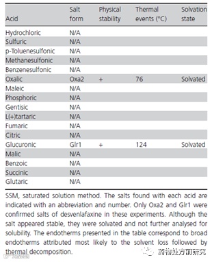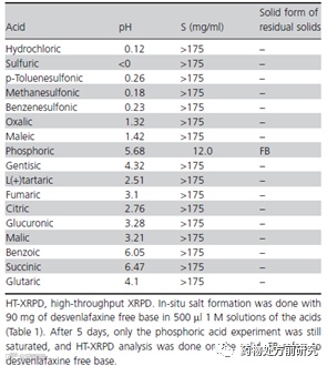 由于去甲文拉法辛具有较高的溶解度,所以设置的反应浓度比较高(10 mg/ml)。然而,在加入酸溶液后得到的都是澄清液(除了phosphoric acid,5天后得到固体是游离态)。作者认为没有达到饱和,但笔者认为也有可能是过饱和的,但没有析出晶体。查阅文献发现去甲文拉法辛游离碱的溶解度随pH减小而增大,在0.1N盐酸溶液中的溶解度为31 mg/mL,所以实验中盐酸盐的溶解度应该低于175 mg/mL,过饱和但没有析出。这种情况也比较普遍,尤其对于溶解度相对比较高的化合物。在这个实验中,phosphoric acid的酸性是比较强的,但依然没有和去甲文拉法辛反应成盐,析出的是游离碱。很显然,这边未能成盐不是溶解度的问题,也不是磷酸的酸性弱,至于为什么没有得到盐还需要进一步的研究。