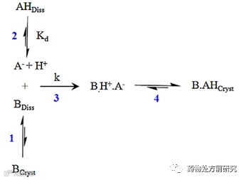 1:游离碱晶体的溶解;2:酸的解离(Kd: dissociation constant);3:溶解的酸和碱的反应(k: reaction constant);4:盐的结晶