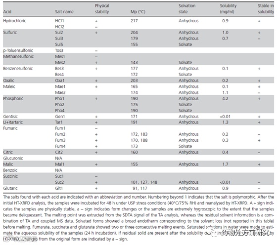 根据化合物在溶剂中的溶解度,采用tetrahydrofuran, acetone, ethyl acetate, 1,4-dioxane, toluene,acetonitrile作为溶剂,对阿立哌唑进行饱和溶液结晶筛选盐型,结果如下表所示。阿立哌唑和大多数酸都得到了晶体盐,除了在methanesulfonic acid, glucuronic acid, benzoic acid 和glutaric acid。在ethyl acetate和toluene中得到了最多的固体,而在acetone, acetonitrile, tetrahydrofuran和1,4-dioxane中得到的固体比较少。XRPD等结果显示17种酸中有13种和阿立哌唑成晶体盐。其中hydrochloride, sulfate, besylate, oxalate, maleate, gentisate, tartrate and malate是晶体盐,物理稳定,且只有单一熔点。Citrate和phosphate是溶剂化物。fumarate salt和p-toluenesulfonate多晶型情况比较复杂。与原位成盐的方式相比,饱和溶液结晶得到了更多的盐,尤其是无水晶型的盐。这主要是因为溶液结晶采用的是有机溶剂,而原位成盐用的溶剂主要为水。与原位成盐相比,饱和溶液反应得到的都是纯相的盐,没有出现混合物的情况。从这点而言,溶液结晶有优势。另外,还测试了不同的盐在水中的溶解度,所有的盐都比游离碱的溶解度高很多。几种溶剂化物在溶解度测试后晶型都发生了改变,这也是意料之中的。