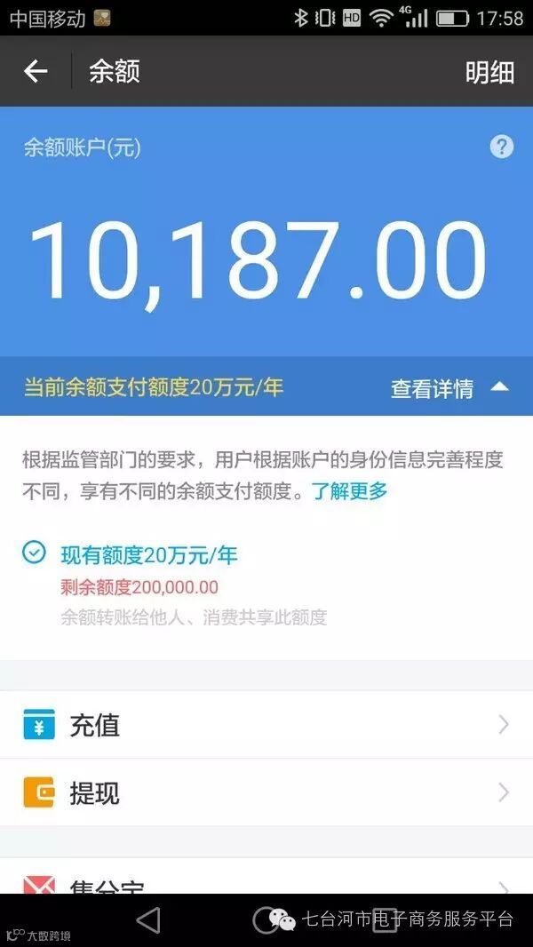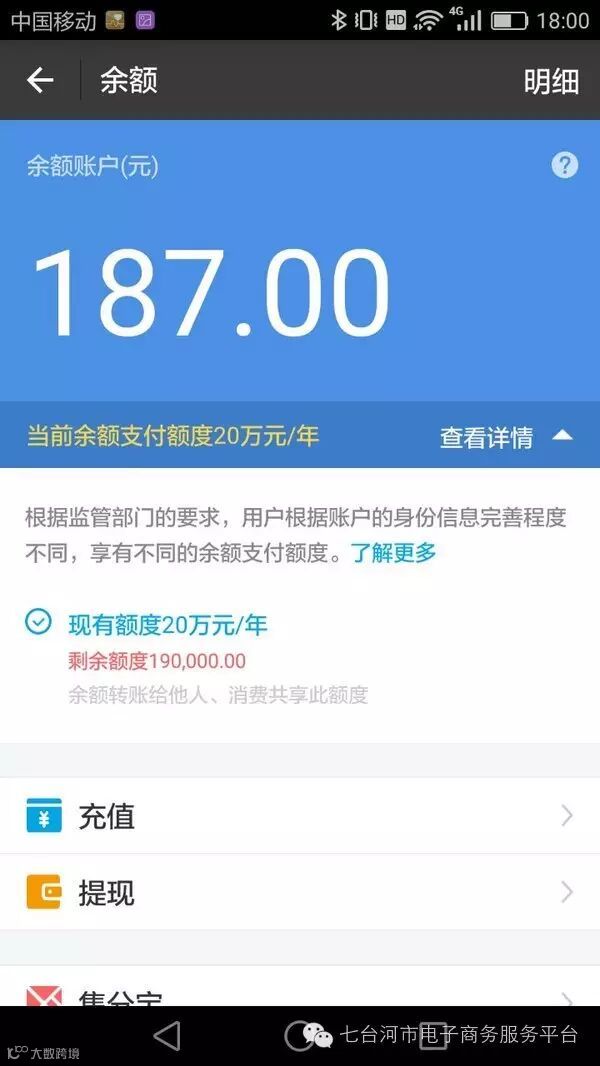 (2)实名认证的初级阶段,即通过至少三个外部渠道进行了验证的账户,属于Ⅱ类支付账户,余额只能用于消费和转账,额度10万元/年,其中不包括从支付账户向本人银行卡的转账,即提现业务。