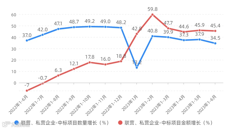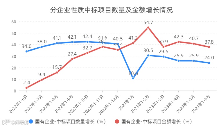 企业经营预期仍受到国际国内环境变化的影响。2023年上半年,国有企业中标项目数量占到12.2%,同比增长24.0%;中标项目金额占到21.1%,同比增长37.8%。联营、私营企业中标项目数量合计占到地区总量的49.4%,同比增长34.5%;中标项目金额合计占到地区总量的66.4%,同比增长45.4%。但需要看到,当前经济内生动力不足,企业经营面临的困难和挑战依然较大。与一季度相比,各类企业投资扩张的意愿均有所减弱。其中,国有企业中标项目数量、金额增速分别下滑5.5、0.1个百分点,联营、私营企业中标项目数量、金额增速分别下滑5.4、2.3个百分点。